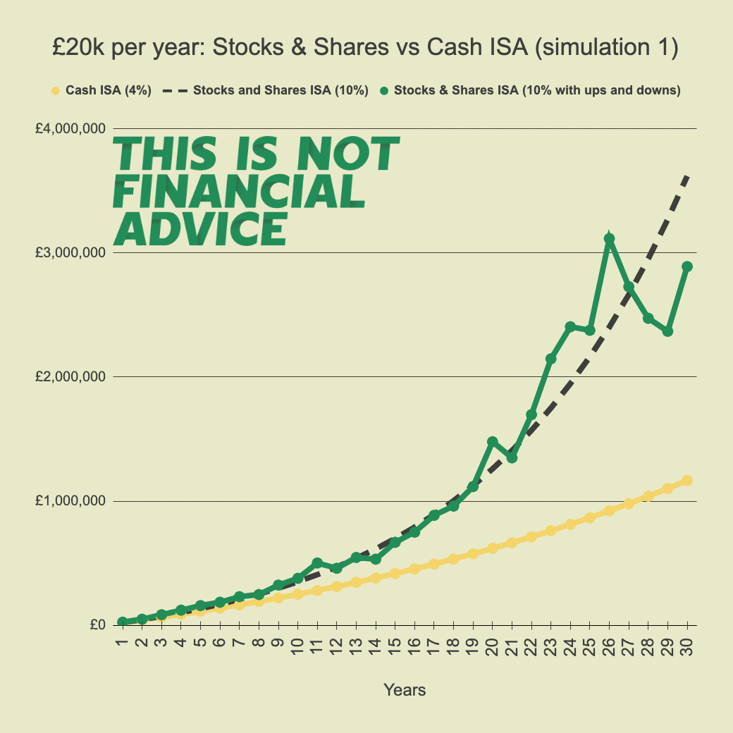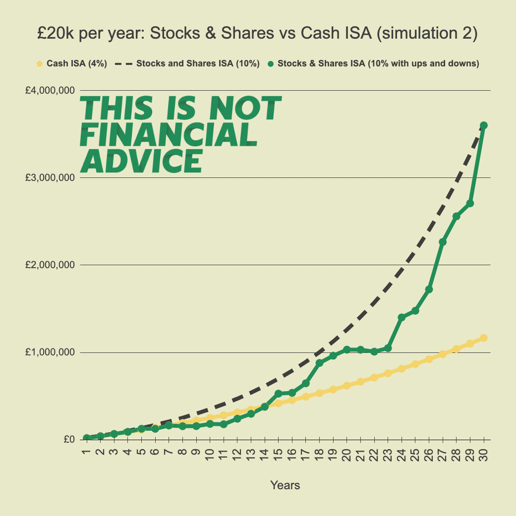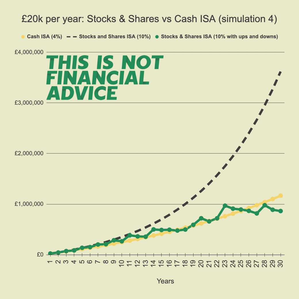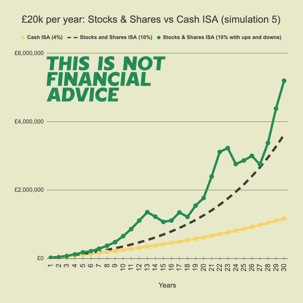 To give you an idea of the kind of returns that cash ISAs and stocks & shares ISAs could generate over a long period of time, I ran 5 simulations. In these, I show the value of a portfolio when investing solely in a 4% cash ISA, versus investing in a stocks & shares ISA with average returns of 10% per year. Since the stock market is unpredictable, I wanted to give you an idea of the kind of value fluctuations that are possible when investing in the stock market, by introducing noise in the data with a standard deviation of 15% (meaning that on average, each year, the returns are +/- 15% versus an average of 10%). Note - these simulations were done completely at random using the parameters described.