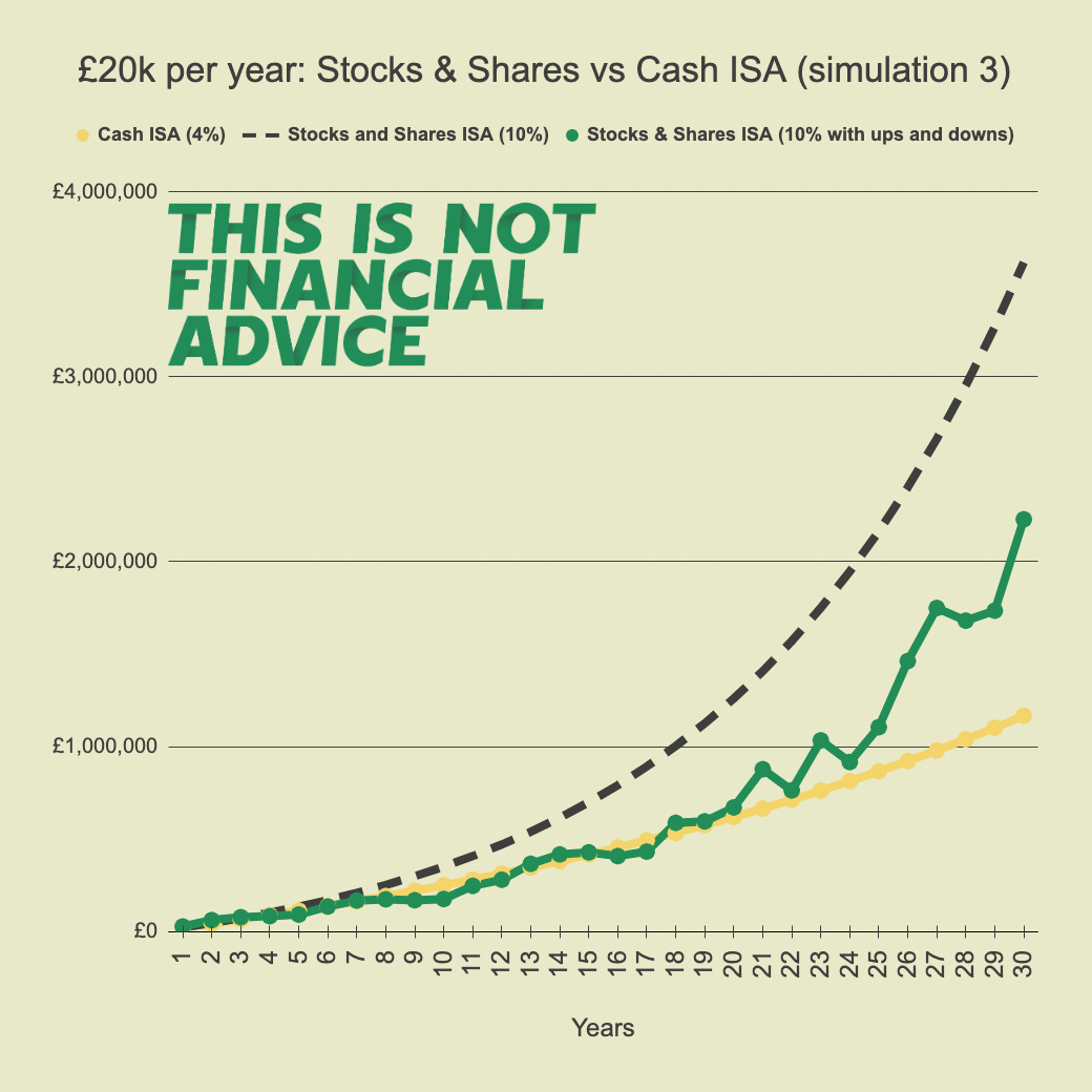 As you can see, the potential outcomes are wide ranging, with simulation 5 becoming a millionaire in 12 years, and simulation 4 not even making it after 30 years. Overall though, statistically and historically, investing in the stock market has given a better chance of superior returns versus interest on cash. In all cases though, we generated large returns, that are completely free of tax, with both types of account.